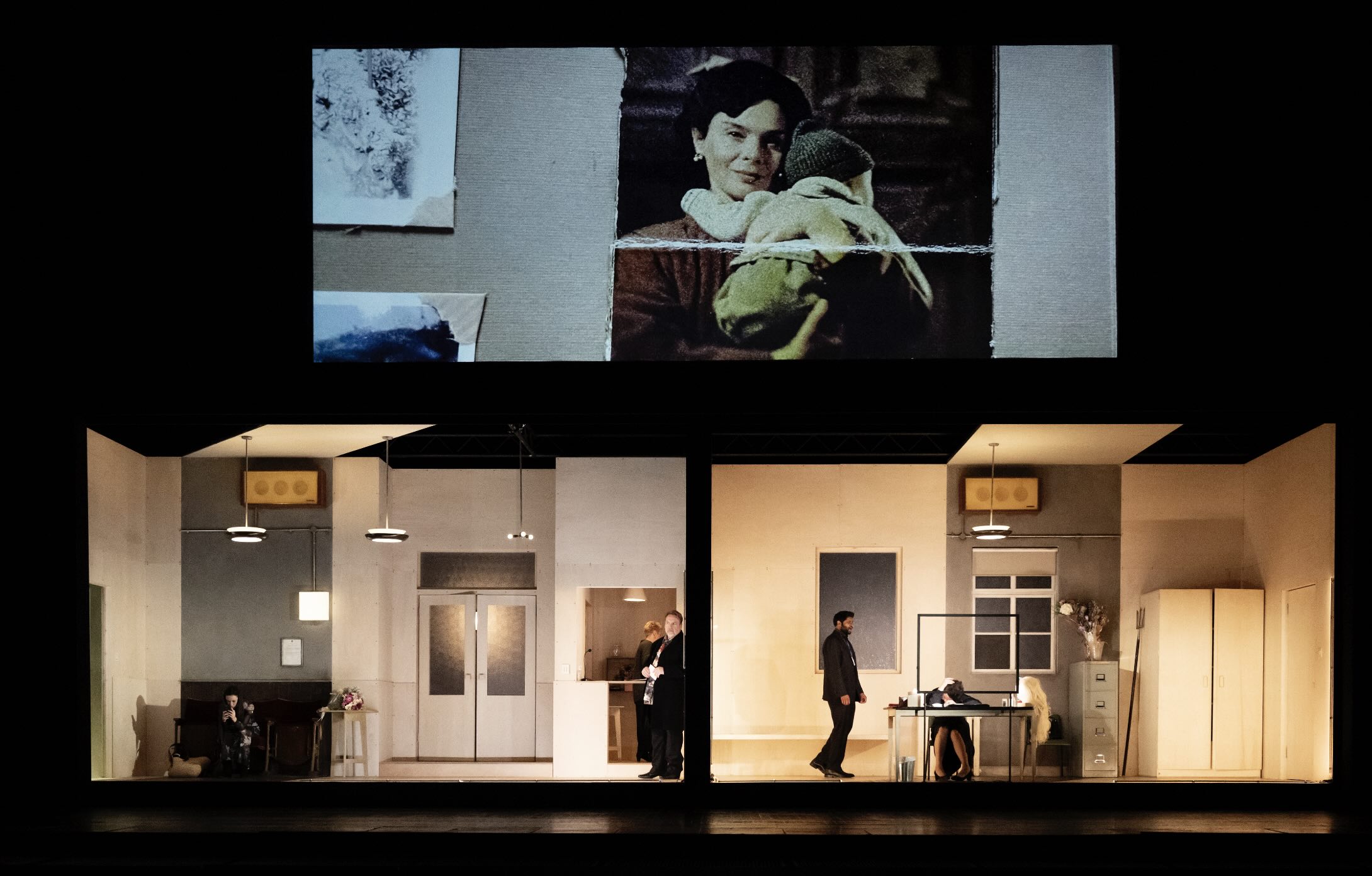 A cramped, busy set for a cramped, busy staging; text messages also appeared in the space with the photo