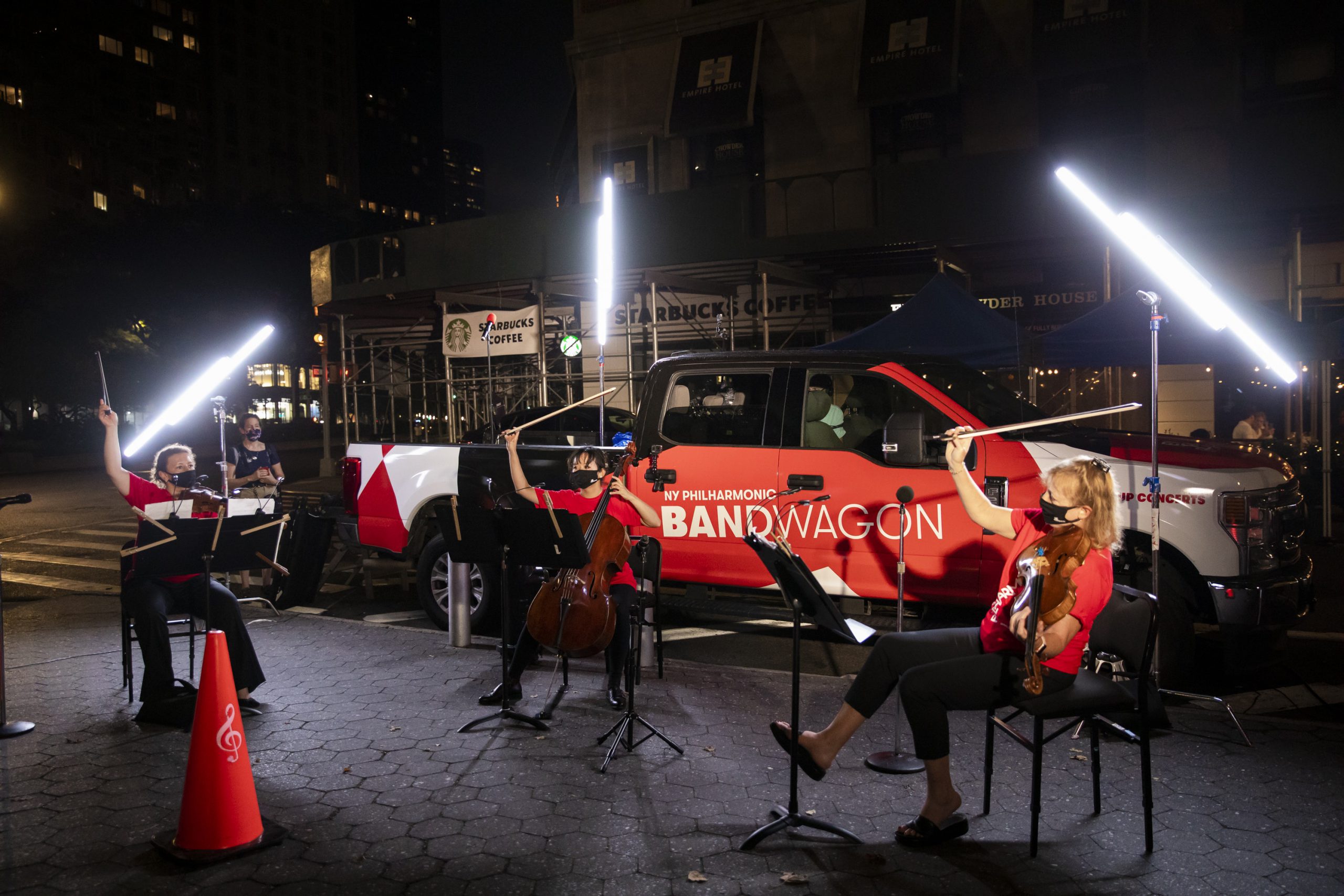 With a rotating cast of between two and five Philharmonic musicians per program, plus Costanzo on vocals, the Bandwagon – a bright red Ford F-250 truck -- presented 81 free concerts over nine weekends in August, September, and October, when the city was emerging from a shutdown. Each weekend featured a different program, with repertoire ranging from several world premieres to a Beethoven string trio to an arrangement of Marvin Gaye’s “What’s Going On.” It was the first time the musicians had played in person with their colleagues for audiences since March.