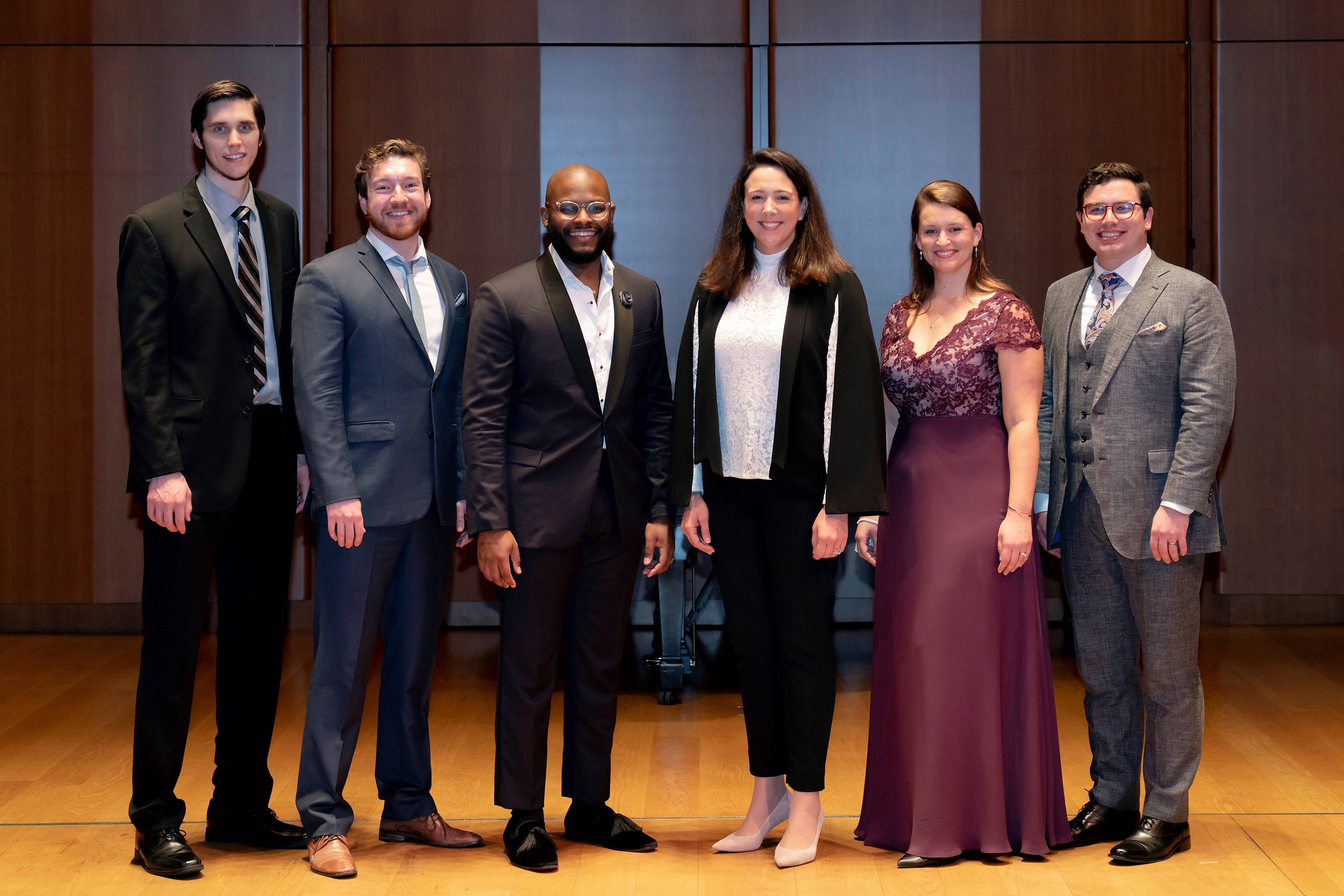 2022 Competition livestream host Susanna Phillips, third from right, with 2022 George London Award winners (left to right) Erik Grendahl, Timothy Murray, Blake Denson, Megan Moore, and Eric Ferring. Photo by Jennifer Taylor
