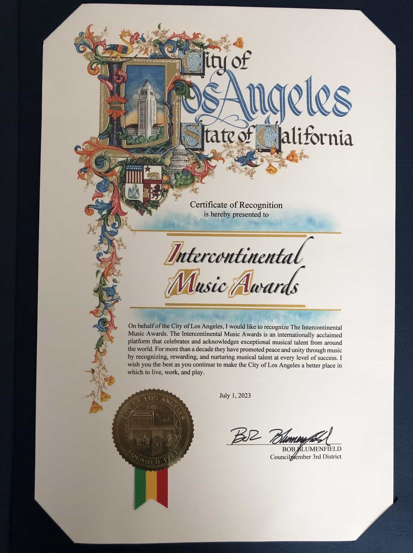 InterContinental Music Awards Receives Prestigious Certificate of Recognition from the City of Los Angeles