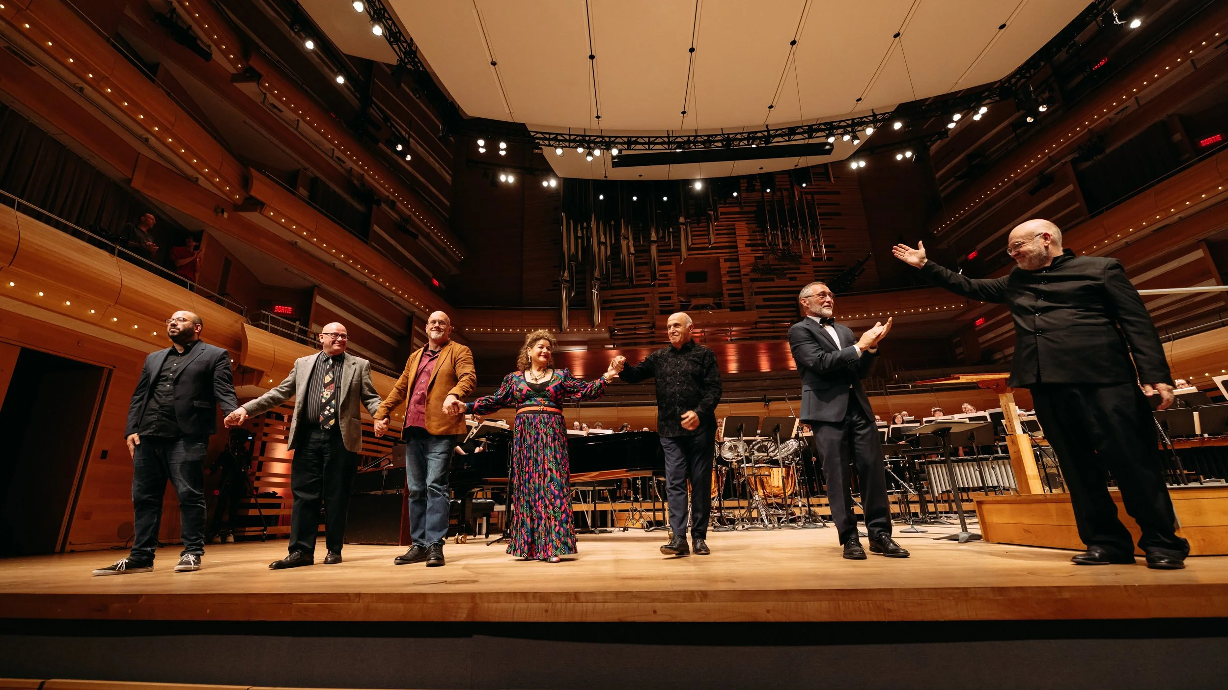 2024 Gala Concert in Montreal. L-R: Yair Klartag, 2024 Azrieli Commission for Jewish Music; Juan Trigos, 2024 Azrieli Commission for International Music; Jordan Nobles, 2024 Azrieli Commission for Canadian Music; Dr. Sharon Azrieli CQ, Chair of the Azrieli Music, Arts and Culture Centre and Board Member of the Azrieli Foundation; Josef Bardanashvili, 2024 Azrieli Prize for Jewish Music; Mario Paquet, MC of the 2024 AMP Gala Concert; and Andrew Megill, Chorus master of The Orchestre symphonique de Montréal and The Orchestre symphonique de Montréal Chorus, at the world premiere of the 2024 AMP prize-winning works at La Maison Symphonique in Montréal, Canada. (Credit: Danylo Bobyk)