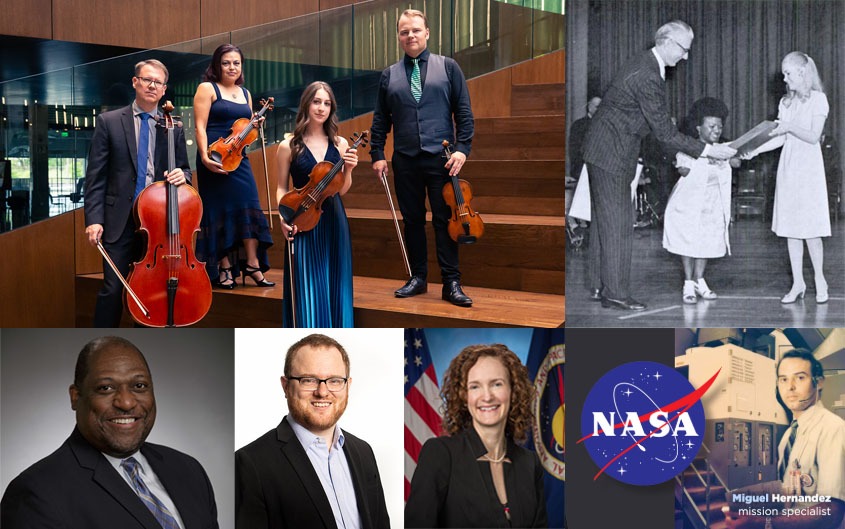 Photo credits: Clockwise from top left: Apollo Chamber Players by Lynn Lane; Shirley K. Price, with NASA administrator James C. Fletcher and First Daughter Tricia Nixon Cox; Miguel Hernandez, Jennifer Ross-Nazzal, Mark Buller, and John Cornelius courtesy of Apollo Chamber Players.