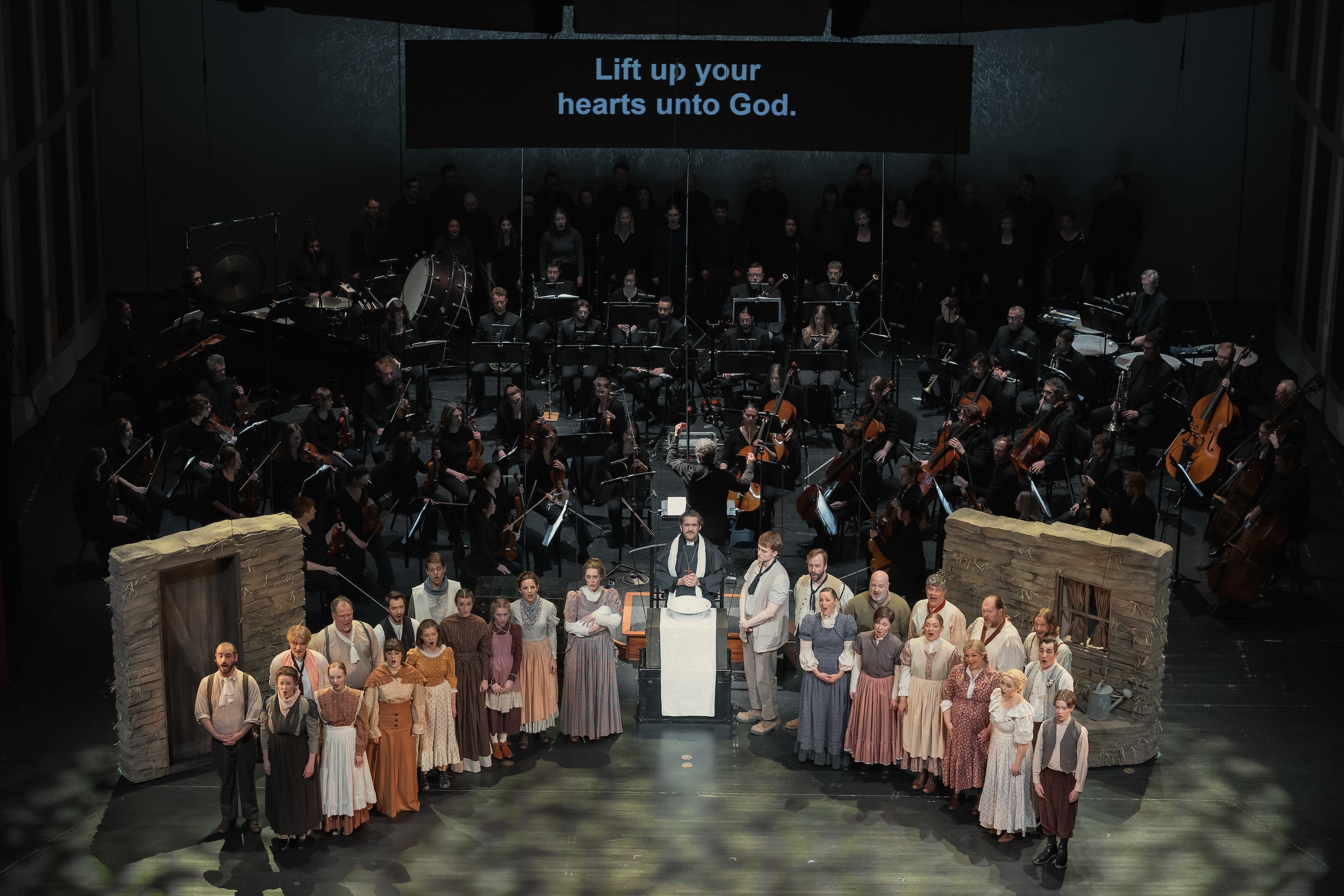 As foreshadowed by that minor-key solo, both opera and novel end tragically. Director Robert Neu’s otherwise effective semi-staging—one needs little more from an opera that unfolds on a wide-open prairie—fumbles here, relying on heavy-handed projections to relay the story’s ending twist. His direction is more attentive elsewhere: The land stakes become an effective recurring prop, and early on, Beret can be spotted knitting the same hat Per wears for Giants’ wrenching climax.