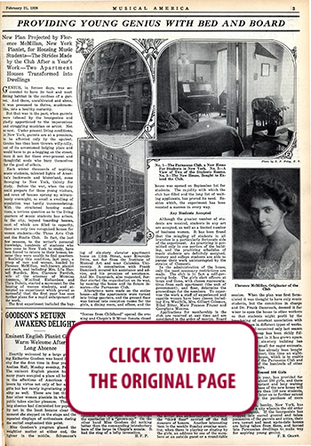 New Plan Projected by Florence McMillan, New York Pianist, for Housing Music Students—The Strides Made by the Club After a Year’s Work—Two Apartment Houses Transformed into Dwellings