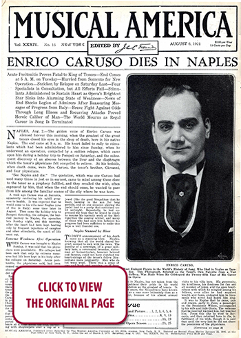 Acute Peritonitis Proves Fatal to King of Tenors—End Comes at 5 A.M. on Tuesday—Hurried from Sorrento for New Operation—Stricken by Relapse on Saturday Last—Four Specialists in Consultation, but All Efforts Fail—Stimulants Administered to Sustain Heart as Opera’s Brightest Star Sinks into Alarming State of Weakness—News of End Shocks Legion of Admirers After Reassuring Messages of Progress from Italy—Brave Fight Against Odds Through Long Illness and Recurring Attacks Proved Heroic Caliber of Man—The World Mourns as Regal Career in Song Is Terminated